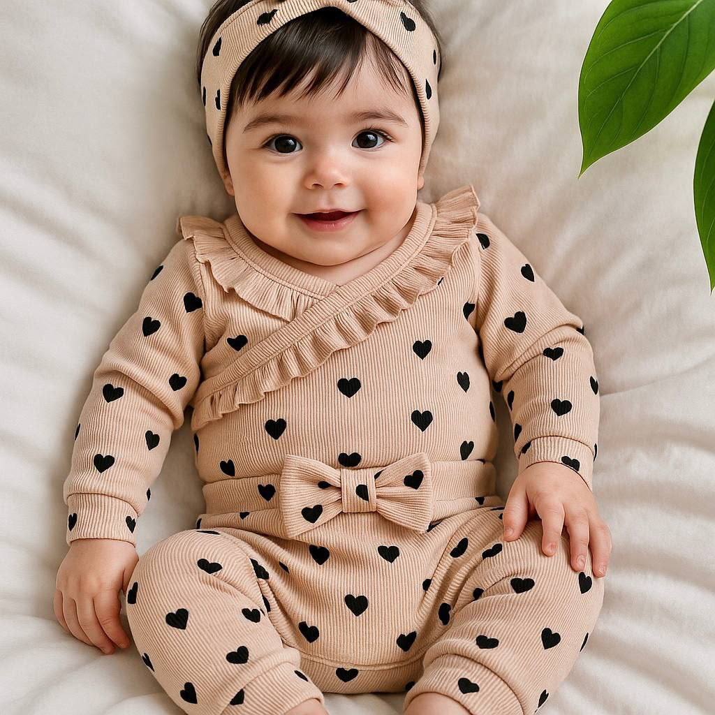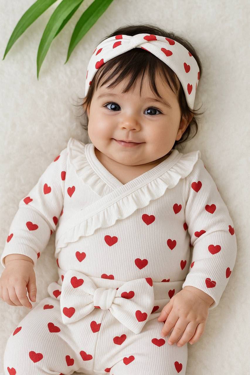 ست سه تیکه قلبی😍😍😍بادی شلوار و هد ، دو رنگ سفید و کرم ، ۴ سایز۶ ماه تا ۲۴ ماه کیفیت عااالی و تضمینی